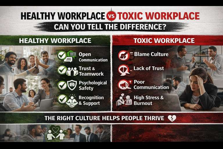 There are clear signs to look for. Healthy workplaces encourage open communication, strong teamwork, psychological safety, and recognition. Toxic workplaces often show blame culture, lack of trust, unclear communication, and constant stress.